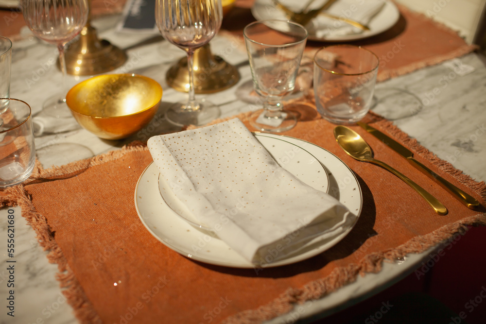 Samolepka Festive christmas table setting with white and gold color plates, tableware, glasses and candles and holiday season decor