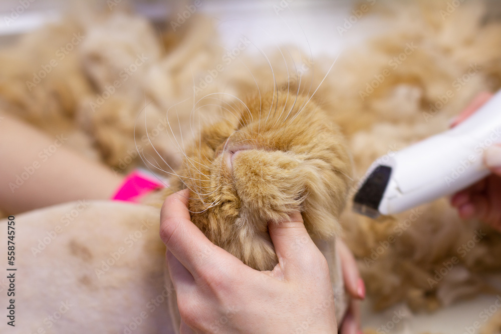 Samolepka A professional veterinary groomer holds a cat's paw with his hand while trimming six with an electric clipper