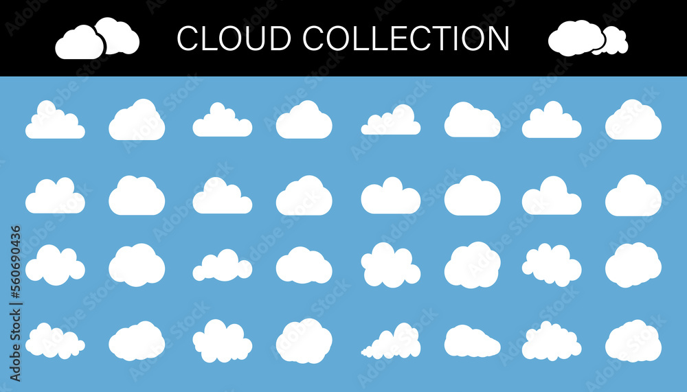 Samolepka collection of white puffy cloud symbols isolated on blue background, icon set ve