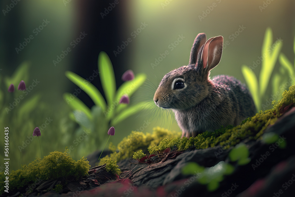 Samolepka cute rabbit in a spring forest scene, generative ai