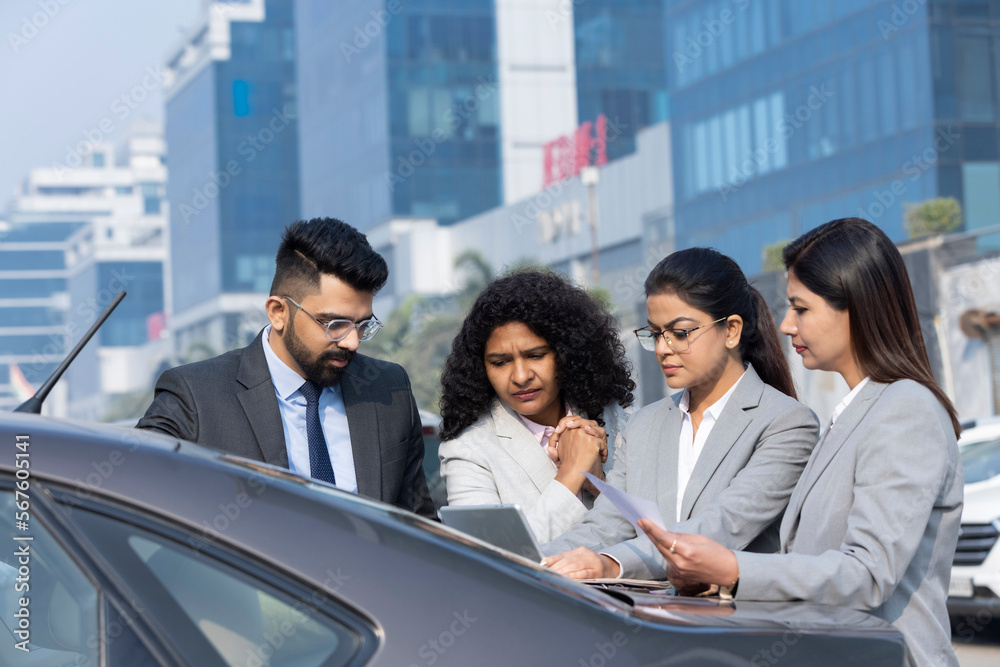 Samolepka Group of businesspeople going through a report at work