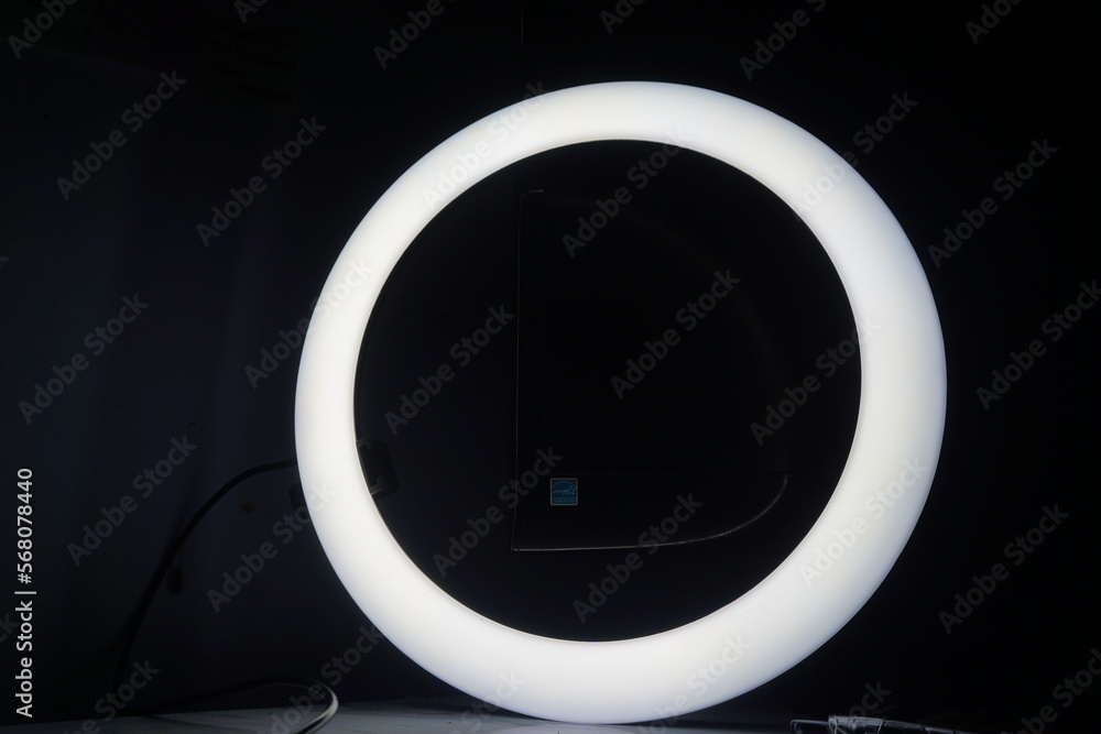Samolepka Neon light circle in black hall room, futuristic concept, abstract geometric background, product display