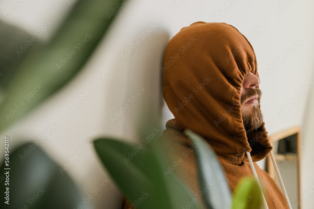 Samolepka Depressed unhappy man covered hood her face - escapism and loneliness mental problem concept