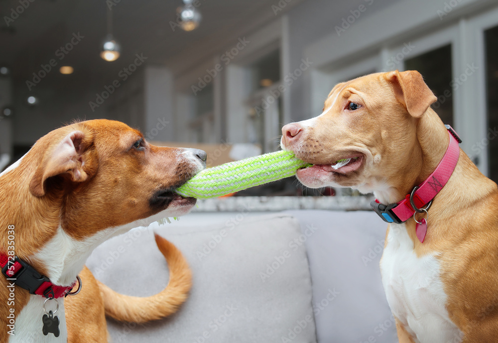 Samolepka Dogs play tug-of-war with rope in mouth on sofa