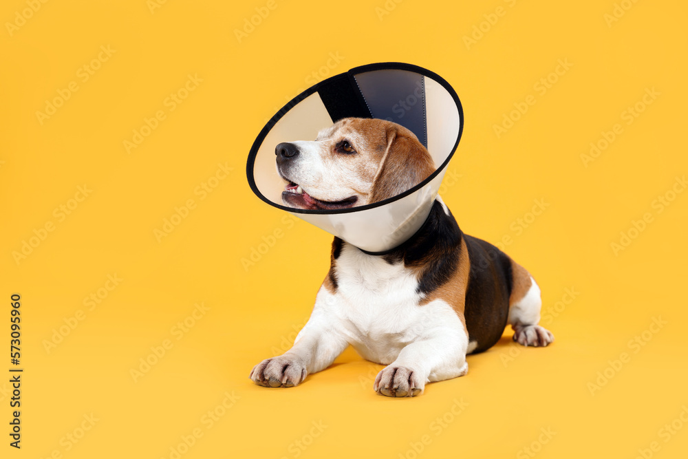 Samolepka Adorable Beagle dog wearing medical plastic collar on orange background