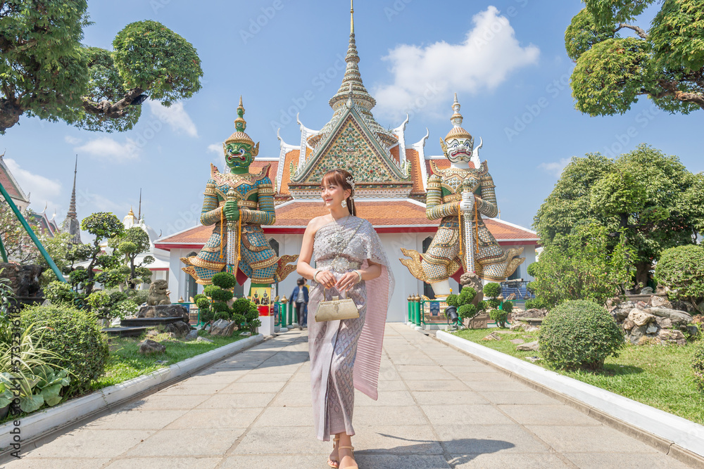 Samolepka Young woman wearing traditional Thai dress stands holding an antique bag with giant front ornaments at the Wat Arun Temple, a popular destination for tourists around the world