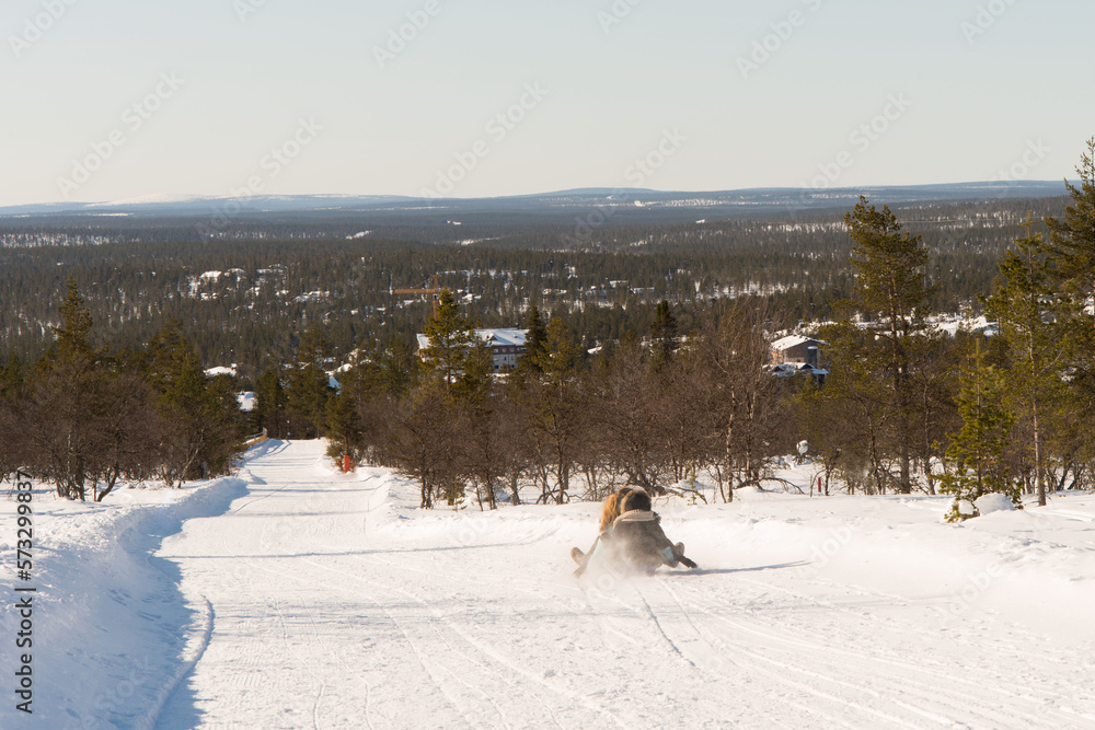 Samolepka Unrecognizable people sledding down a tobogganing run in Lapland