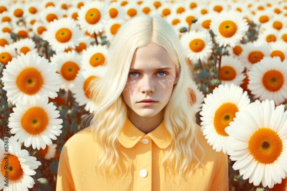 Samolepka Portrait of a beautiful blonde girl standing in the middle of a field of daisies- Ilustration