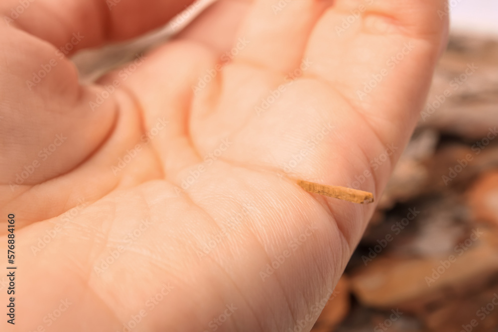 Samolepka Woman with splinter in her hand on blurred background, closeup