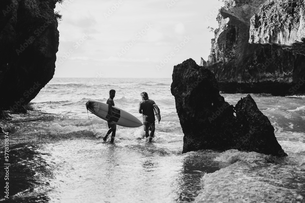 Samolepka Man with a surfboard goes to the Uluwatu surf spot.