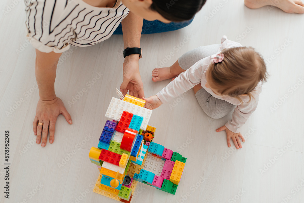 Samolepka young nanny and adorable child playing with multicolored building blocks on floo