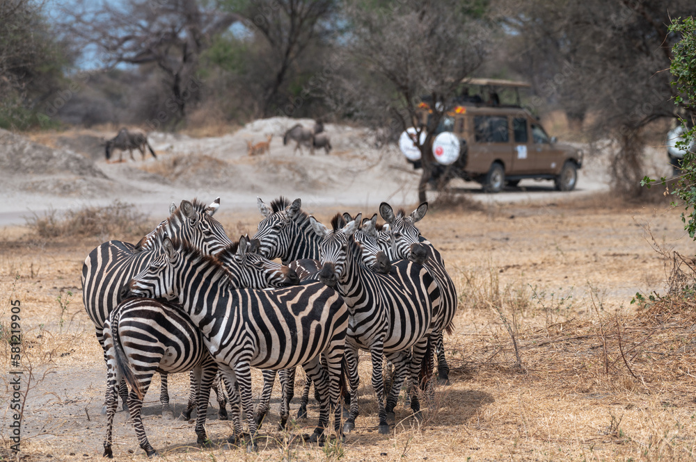 Samolepka Group of wild zebras together, protecting each other, with an off-road safari ve