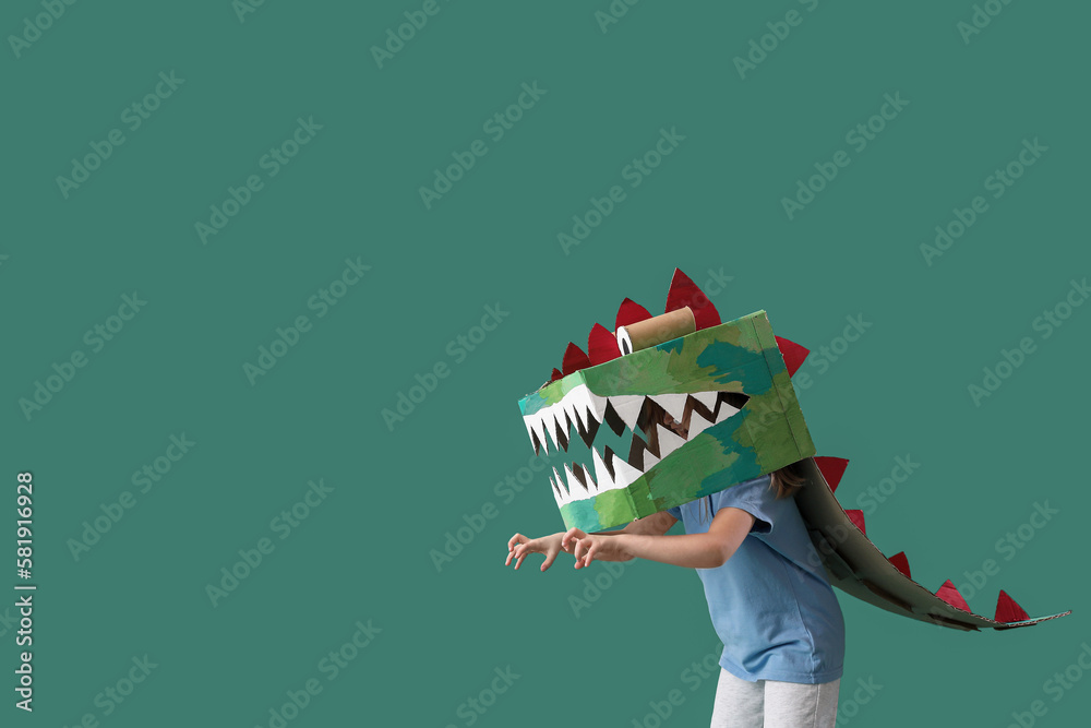 Samolepka Little girl in cardboard dinosaur costume on green background