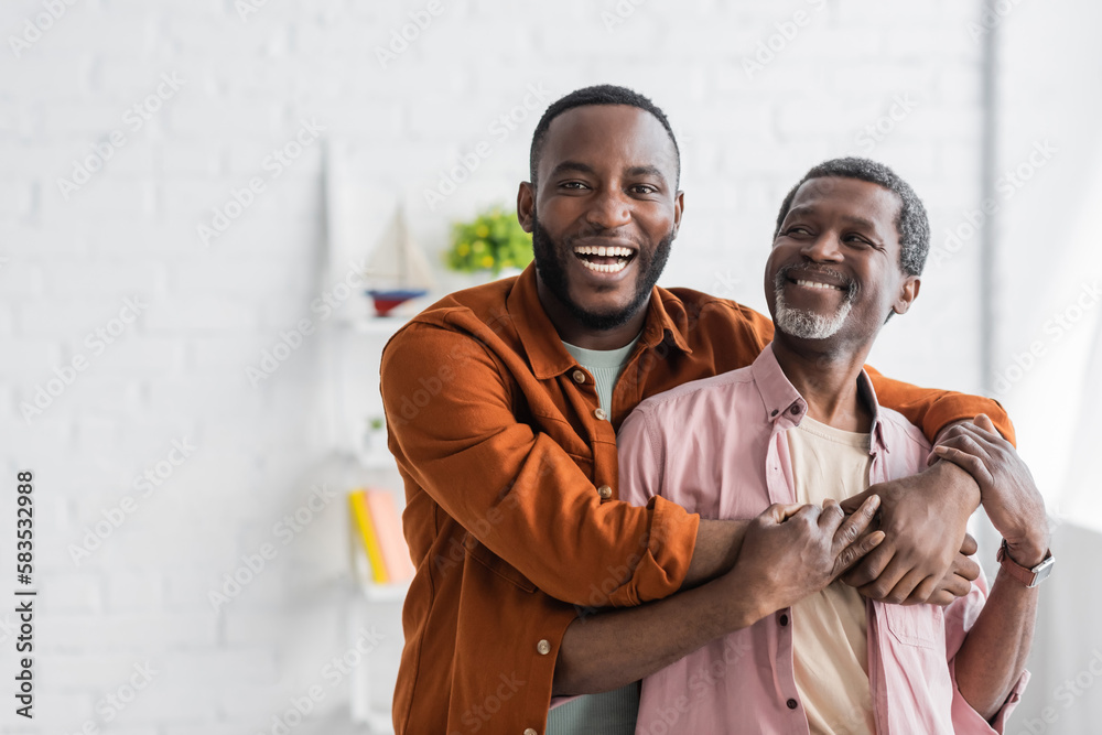 Samolepka Cheerful african american man hugging mature dad and looking at camera at home