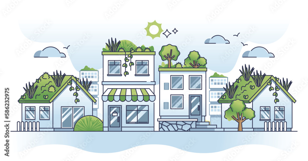 Samolepka Green roofs for sustainable homes with rooftop gardening outline concept