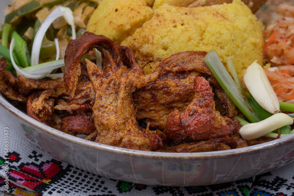 Samolepka Vegan corn mush mamaliga, seitan, beans fermented vegetables and beans as Easter
