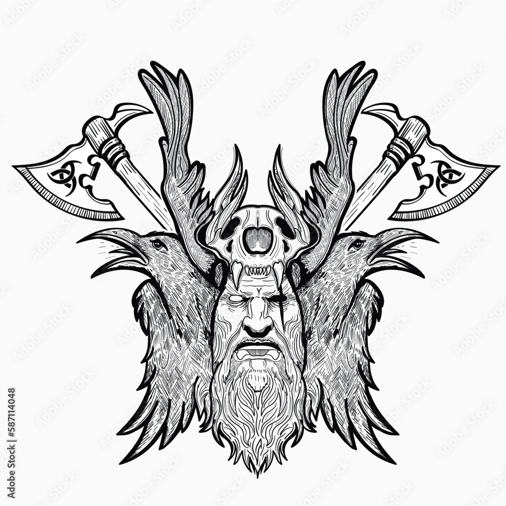 Samolepka Scandinavian god Odin in viking helmet with two ravens black and white illustrat