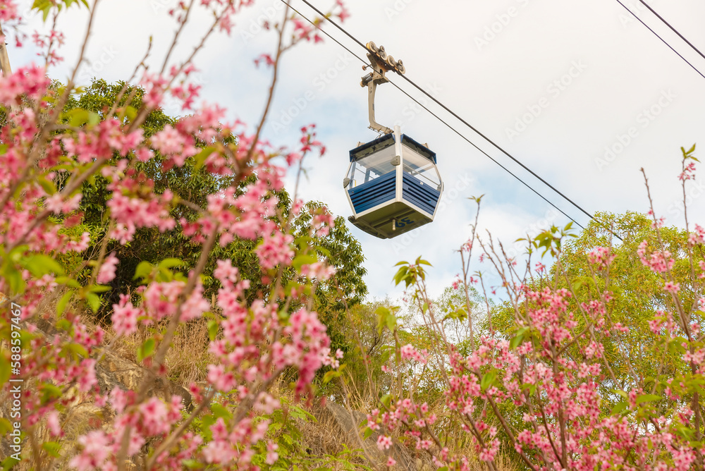 Samolepka Cable car with cherry blossom in full bloom in Hong Kong