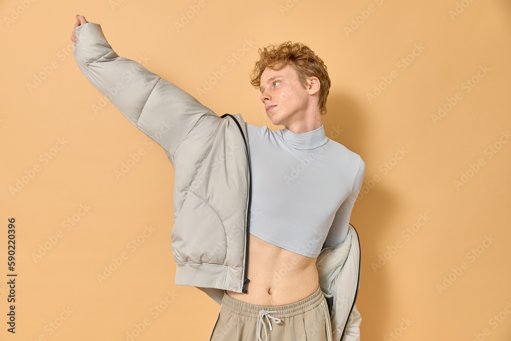 Samolepka Young ginger curly haired male gen z model in pastel beige tight long-sleeved cropped top, pants and jacket raises his hand up looks away and poses over yellow background