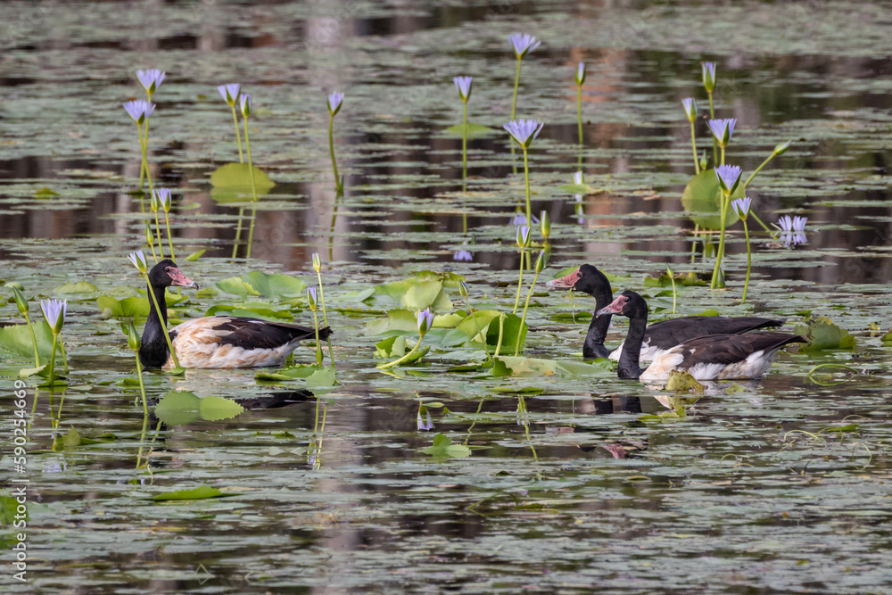 Samolepka Magpie Geese (Anseranas semipalmata) among the waterlilies at Urunga Wetland, NS