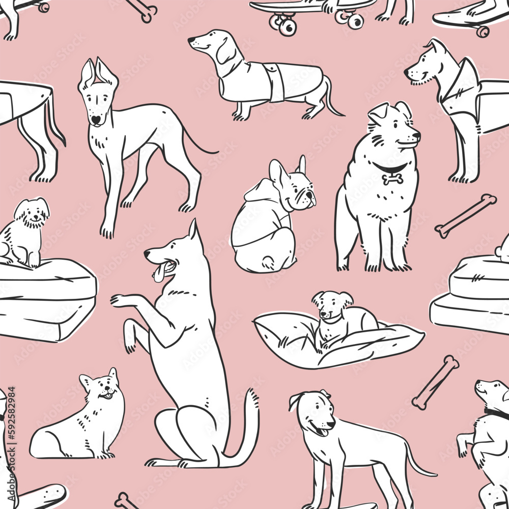 Samolepka Hand drawn vector abstract graphic line art seamless pattern with diverse cute cartoon dogs characters
