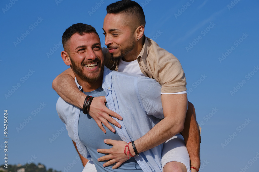 Samolepka Man carrying his boyfriend on his back while having fun together outdoors