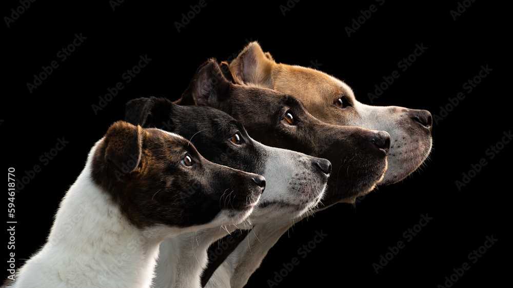 Samolepka group of four dogs sitting head profile portrait on a black background in the st