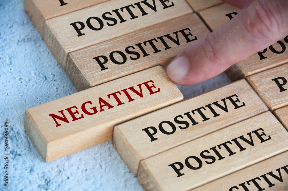 Samolepka Finger pushing negative text on wooden block from the rest of the wooden blocks with positive text
