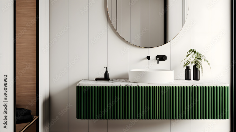 Samolepka The scene is set in a modern and minimalist bathroom with a stunning vanity design, featuring a sleek marble countertop and a white round ceramic washbasin