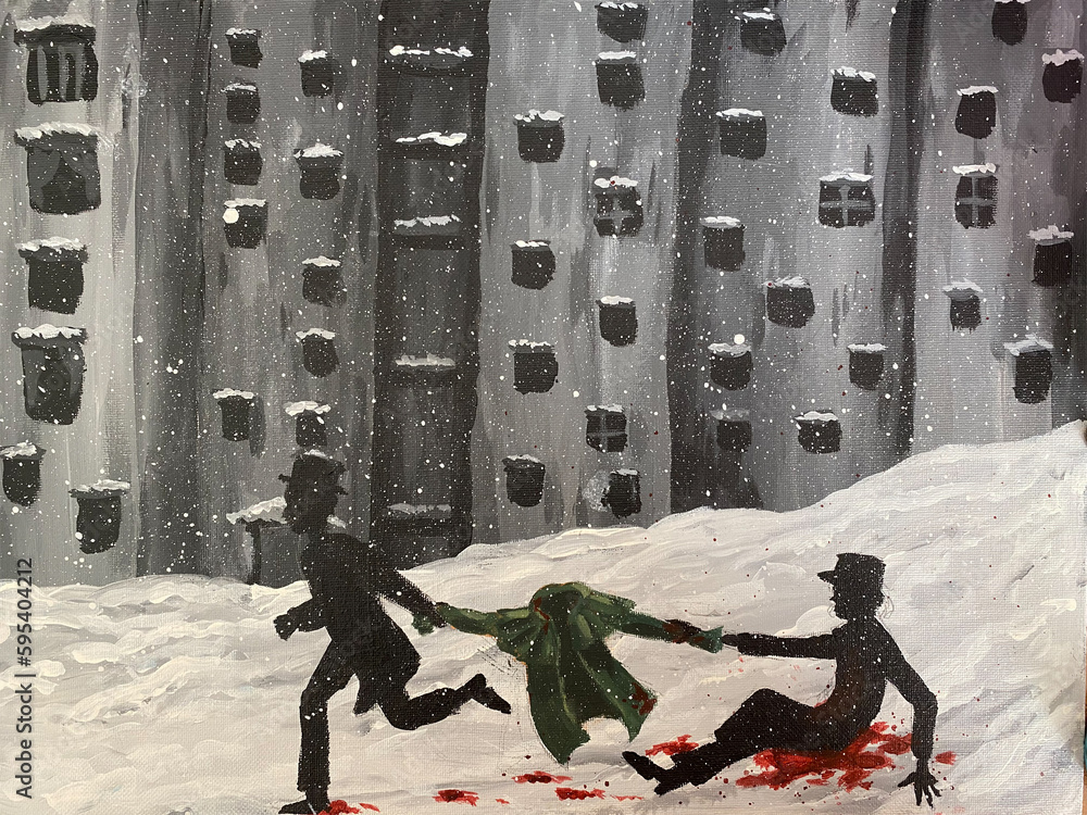 Samolepka hand drawn watercolor painting; Inspirited Scene of Gogol's novel The Overcoat
