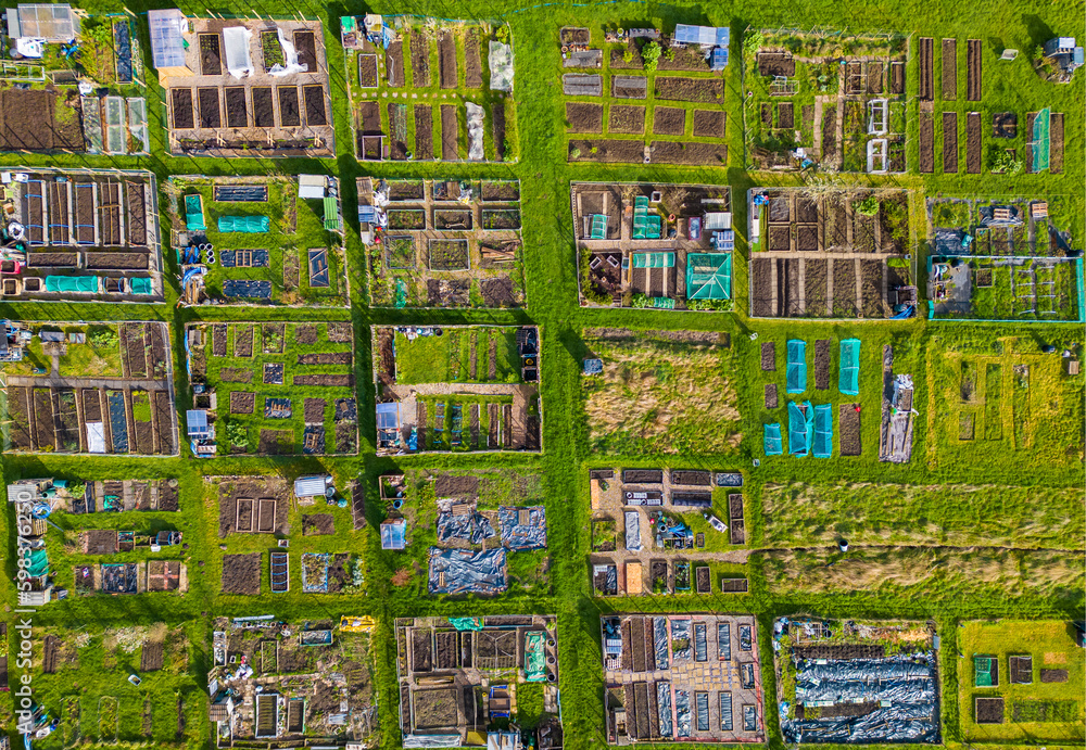 Samolepka Aerial view of vegetable allotments forming geometric pattern in spring weather
