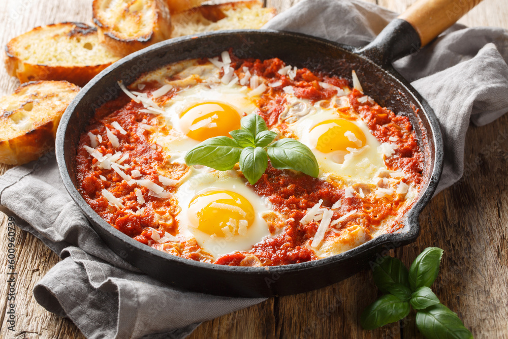 Samolepka Eggs in purgatory with tomato basil garlic sauce and a sprinkling of Parmesan closeup on the skillet on the wooden table