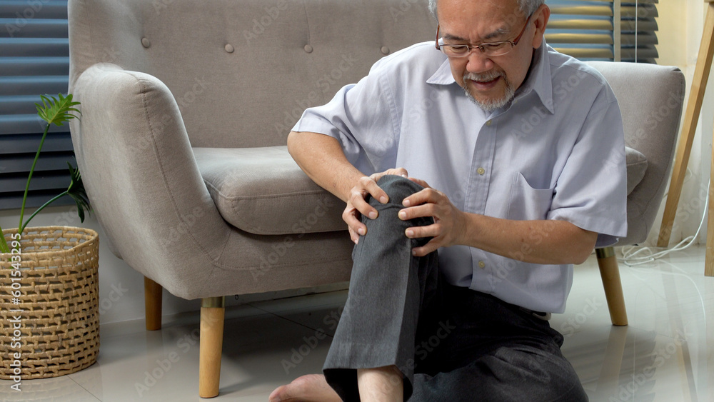 Samolepka Elderly asian man touching knee hurt painfully problem sitting on floor at home