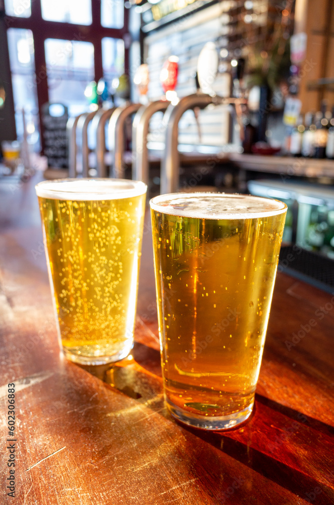 Samolepka Close up of pint glass of lager on the bar of a traditional English pub in the U