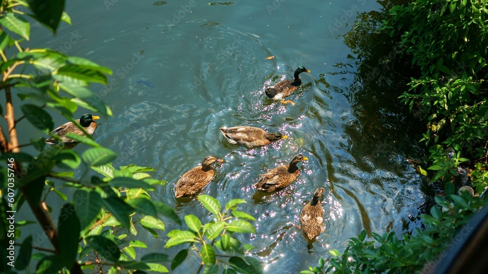 Samolepka Top view of a group of ducks swimming in the water on a sunny day
