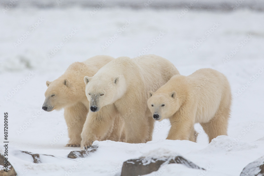 Samolepka Mother and two cubs seen walking along the shores of Hudson Bay during fall, winter with snow white background in Canada