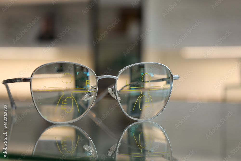 Samolepka glasses on the table, eyeglass progressive lens on table in clinic