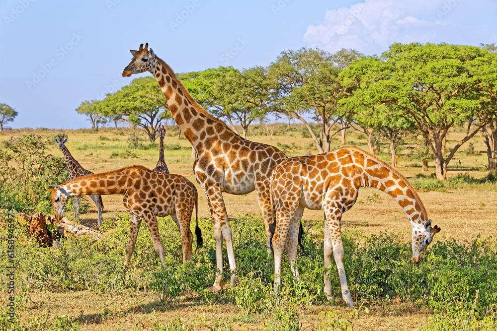 Samolepka A small herd of giraffes feeding in natural habitat, Murchison Falls National Park, Uganda, Africa