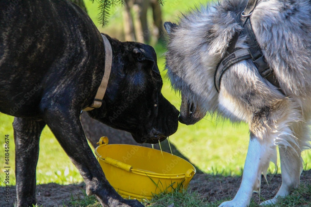 Samolepka two dogs fighting over a yellow bowl in a grassy area