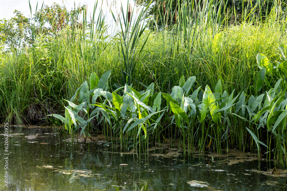 Samolepka A group of arrowhead plants on the edge of a pond with rushes and cattails in the background