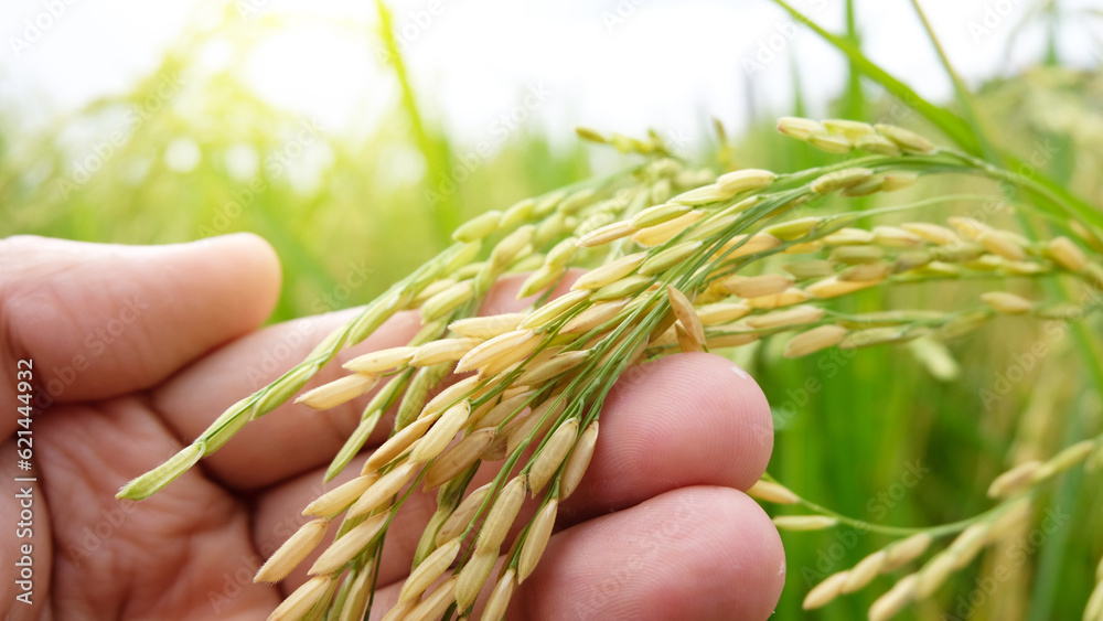Samolepka Hand tenderly touching a young rice in the paddy field, Hand holding rice with warm sunlight, Closeup of yellow paddy rice field with golden sun rising in autumn