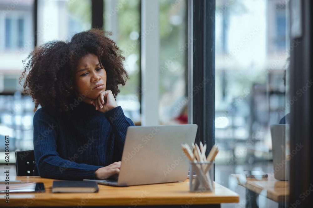Samolepka African American are stressed and tired from work sitting at desk in the office, feeling sick at work, stress from work