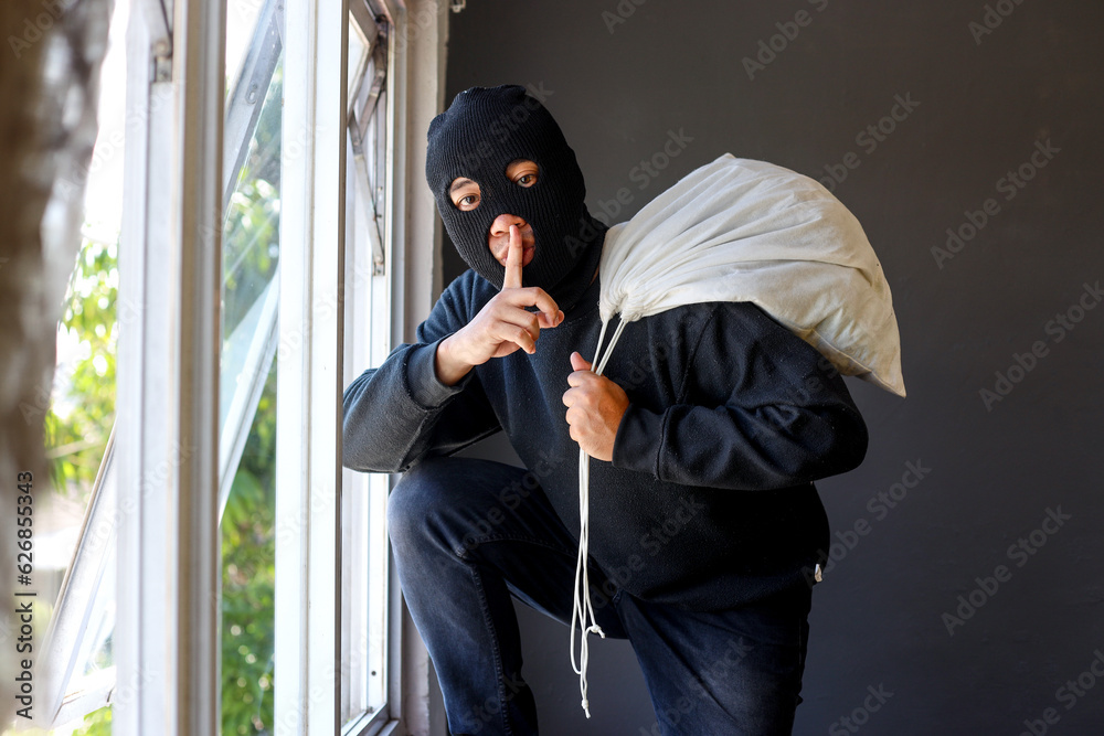 Samolepka Thief in black clothes wearing a mask carrying a large bag of loot over his shou