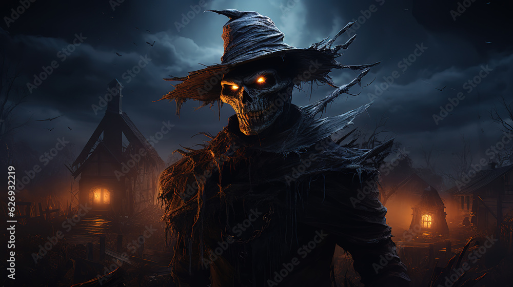 Samolepka Illustration horror,scarecrow, halloween night house ,dark fantasy painting