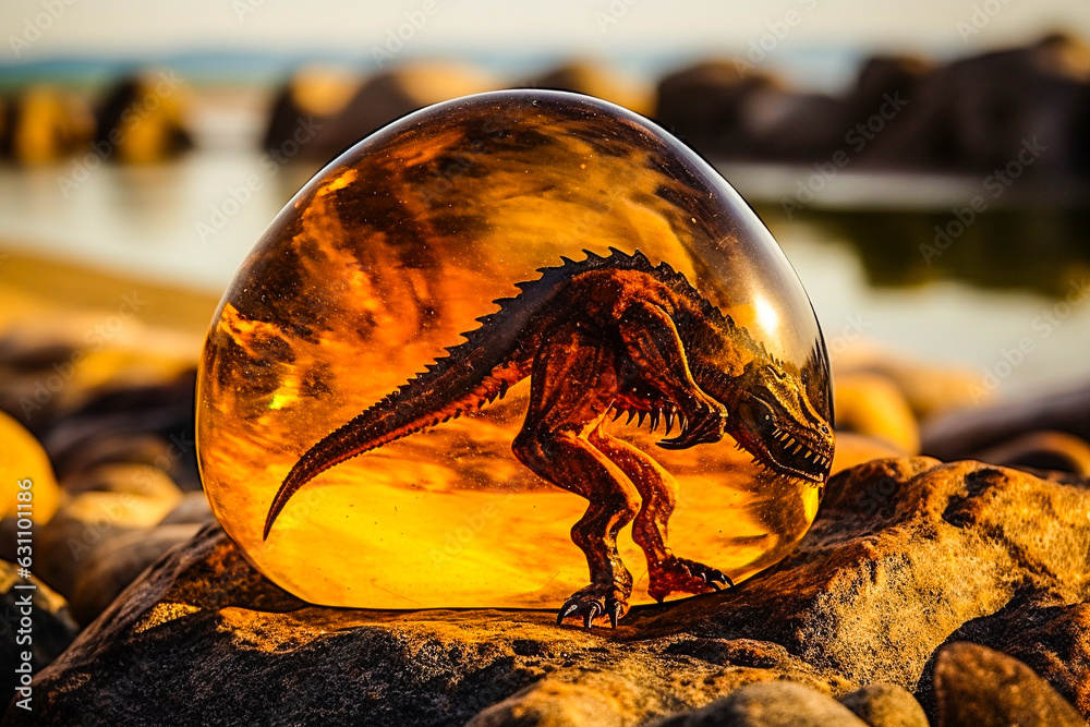 Samolepka Boule d'ambre avec un bébé dinosaure en inclusion - Morceau d'ambre jaune conten