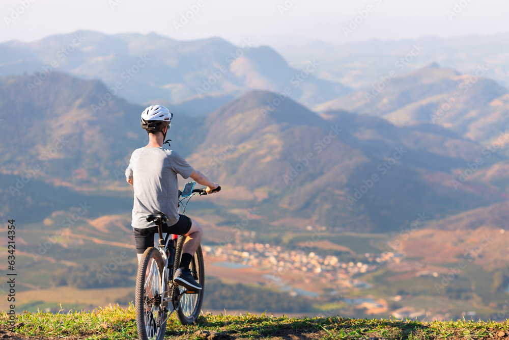 Samolepka Cyclist resting with his mountain bike while admiring the mountainous landscape in the background