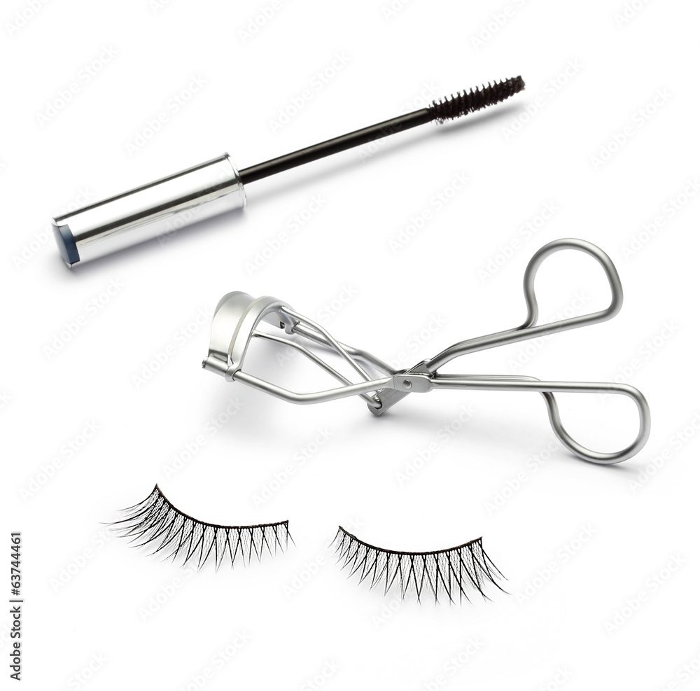 Samolepka fake false eyelash with eyelash curler and mascara on white