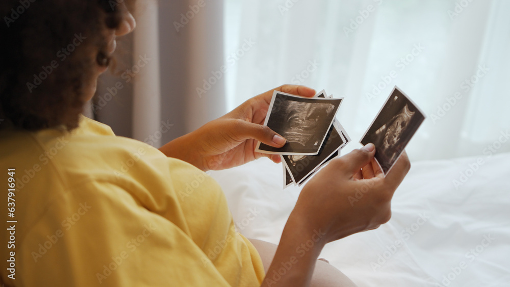Samolepka Black African American pregnant woman looking her ultrasound scan photos on bed