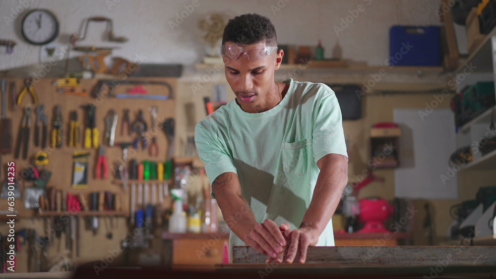Samolepka Young apprentice at carpenter workship sawing and measuring piece of wood with industrial equipment