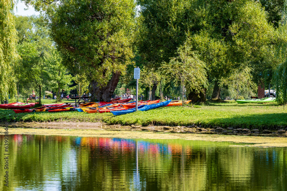colourful sea kayaks from a day camp on grass beside the water in the toronto islands (city park) room for text